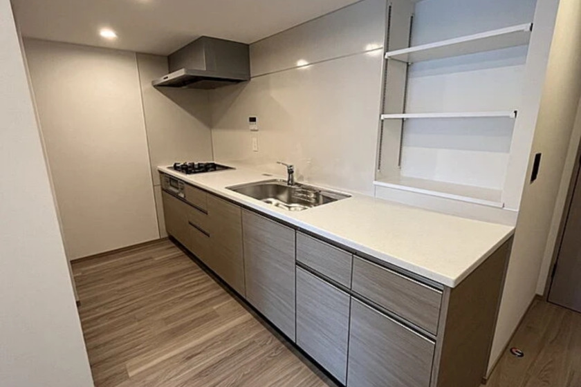 The interior boasts a contemporary design with high-quality finishes. All rooms are fitted with wooden flooring, enhancing the clean and sleek look of the apartment. The kitchen is a highlight, equipped with a system kitchen including a gas stove that supports three or more burners and a grill, ideal for culinary enthusiasts. The inclusion of four air conditioners ensures a comfortable climate year-round.