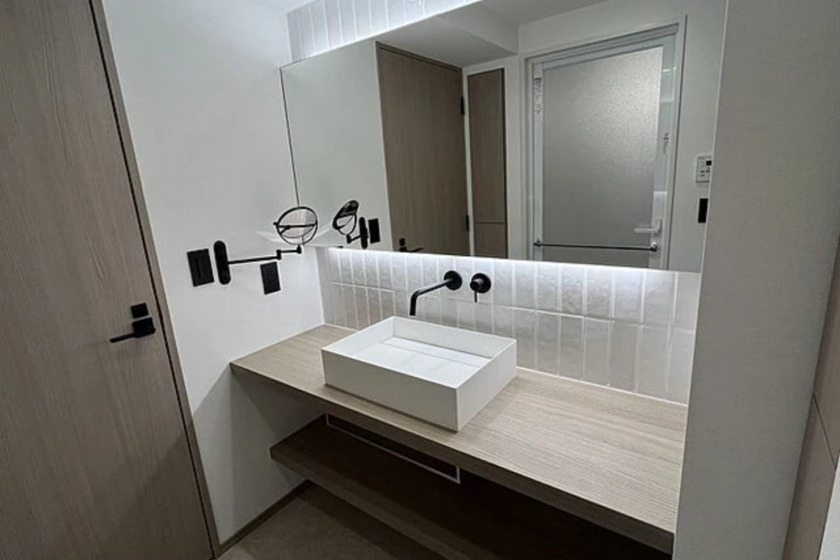 The 2SLDK (two bedrooms, a living/dining/kitchen area, and a separate service room) features a practical and spacious layout. The living/dining/kitchen area measures more than 18.36 m², providing ample space for relaxation and entertainment. Each bedroom is well-sized, suitable for comfort and privacy, complemented by additional storage options including two walk-in closets.