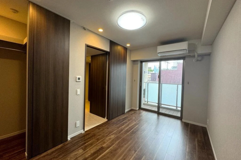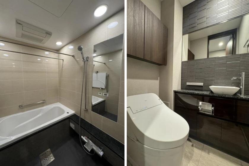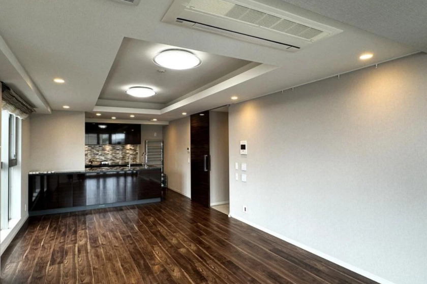 The interior boasts high-quality finishes with wooden flooring throughout all rooms, contributing to a cohesive and stylish look. Each bedroom is equipped with storage solutions including walk-in closets and additional three closets, addressing ample storage needs. The kitchen is a highlight with its modern system kitchen including a water purifier, dishwasher and dryer, and a countertop design that makes cooking a pleasure. The inclusion of floor heating and air conditioning in all rooms ensures comfort throughout the seasons.