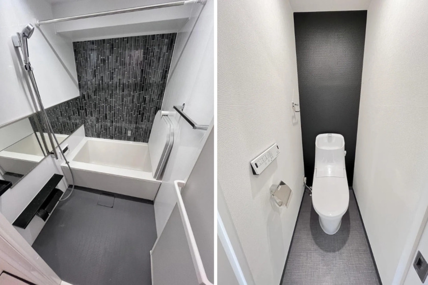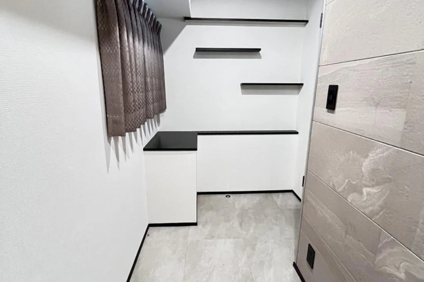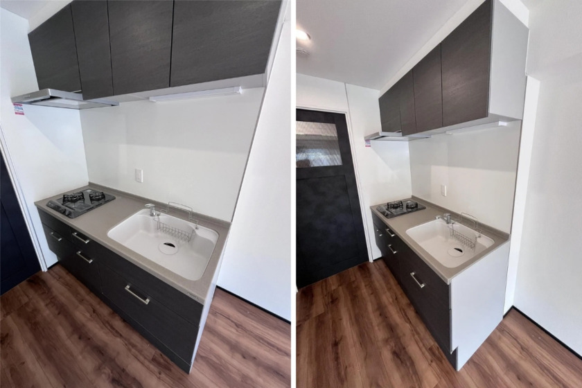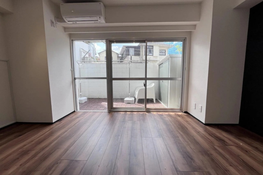 Recently remodeled, the interior features sleek wooden flooring that runs throughout, offering both aesthetic appeal and easy maintenance. The inclusion of a system kitchen with a 2-burner stove and a separated bathroom and washroom enhances practicality. The space also benefits from modern conveniences such as air conditioning, a bathroom dryer, and a warm water washing toilet seat.