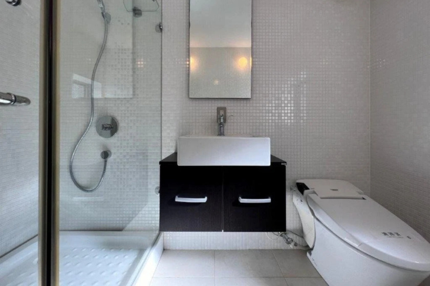 The interior boasts a contemporary design with clean lines and high-quality finishes. Flooring throughout adds a touch of elegance, while the inclusion of four air conditioners ensures comfort in all seasons. The system kitchen is a modern cook’s dream, equipped with a microwave oven, dishwasher, and dryer, enhancing functionality and style. Additional comforts include a bathroom with reheating function and a warm water washing toilet seat.