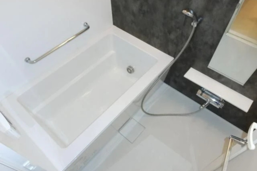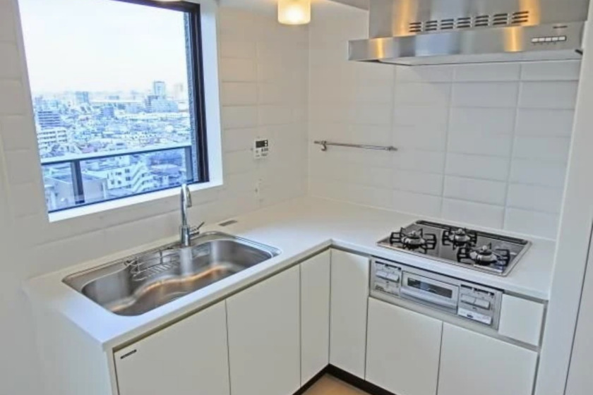 Inside, the apartment presents a modern aesthetic with all rooms boasting wooden flooring and air conditioning. The kitchen is well-appointed with a gas stove, grill, and a system kitchen setup that features a window, making cooking a pleasant experience. Additionally, the bathroom is separated from the toilet area and includes upscale fixtures like a reheating function and a bathroom dryer.