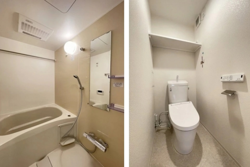 The apartment features a practical 2LDK layout that maximizes the use of space. It includes two bedrooms and a spacious living/dining area, all benefiting from ample natural light due to its southeastern exposure and three-sided lighting. The smart floor plan ensures no space is wasted, with distinct areas dedicated to living, sleeping, and services, making it ideal for singles, couples, or small families looking to manage space efficiently.