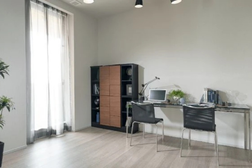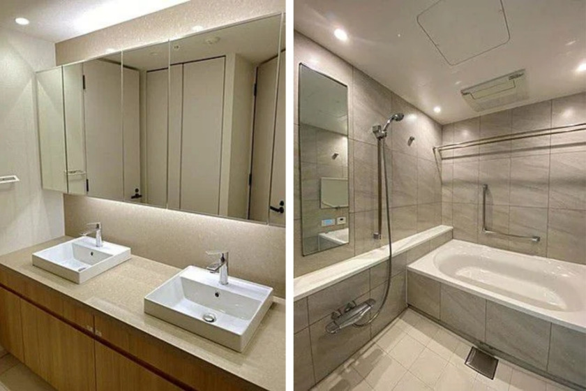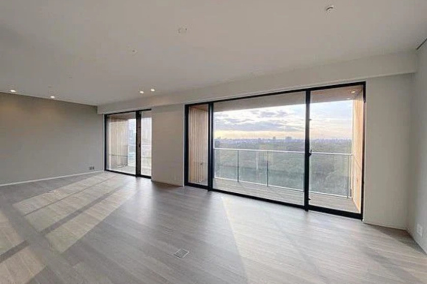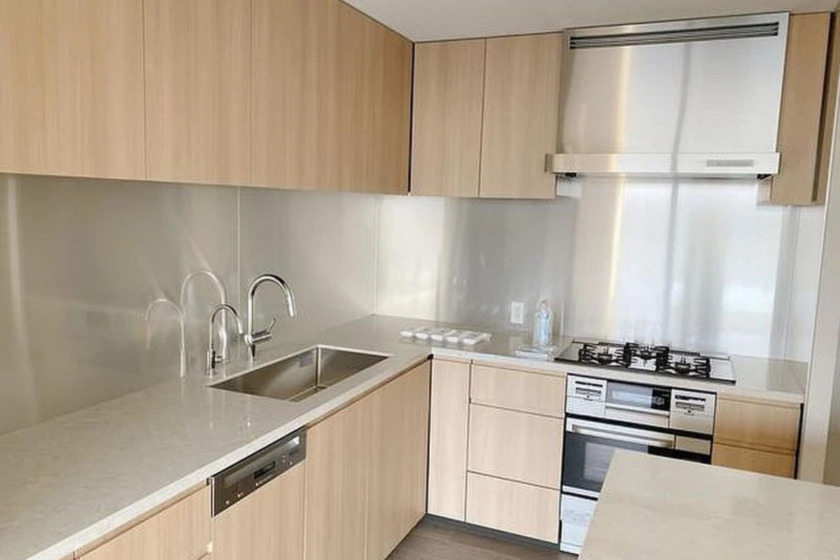The interior embodies a modern aesthetic with clean lines and high-quality flooring. Each room is equipped with air conditioning and floor heating, ensuring comfort throughout the seasons. The living area is bright and airy, thanks to large windows that allow plenty of natural sunlight. Additional features like a bathroom dryer, a warm water washing toilet seat, and an independent washroom add to the functional luxury of the apartment.