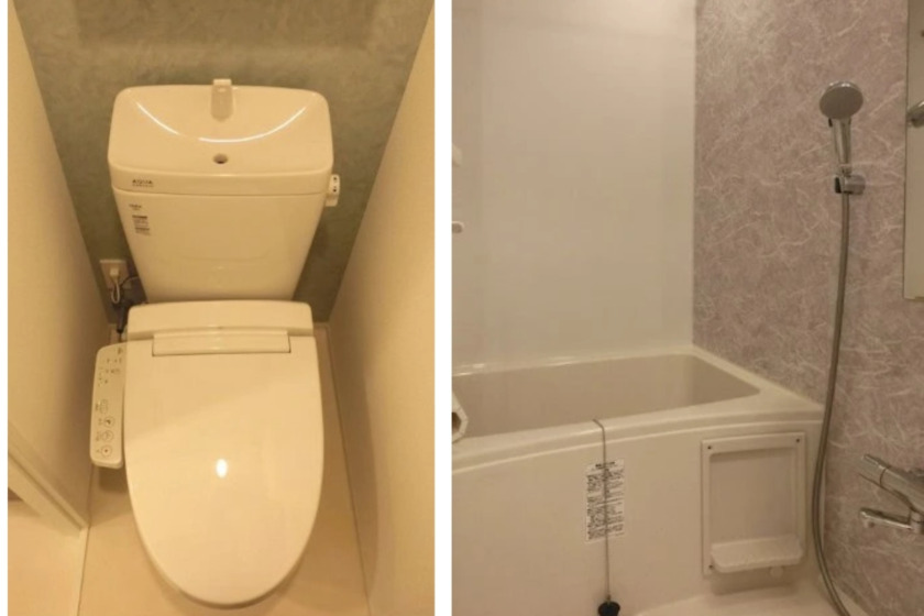 The interior features modern amenities such as air conditioning, a system kitchen with a two-burner stove, and a bathroom equipped with a dryer, promoting a comfortable urban living experience. The inclusion of a warm water washing toilet seat and a furnished option with no internet fee adds to the convenience.
